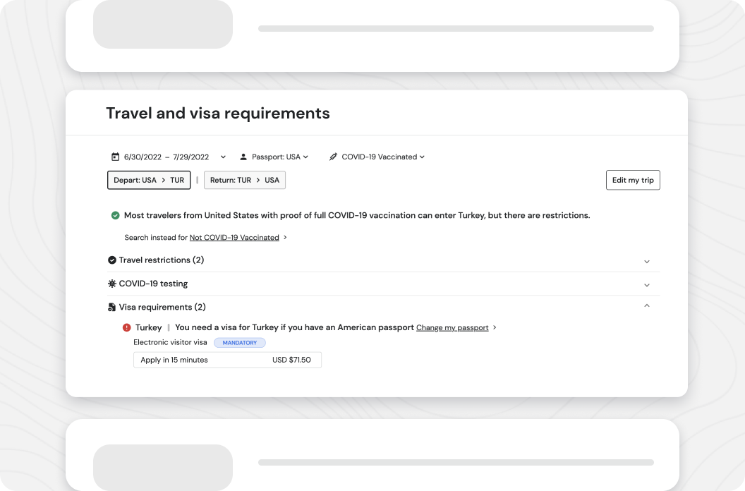 2. Receive real-time updates on visa requirements, entry restrictions, and travel advisories for your specific trip.